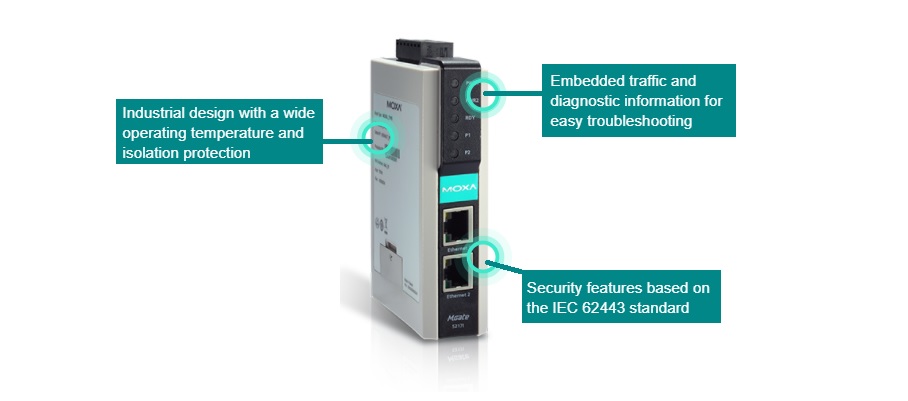 De MGate 5217I-serie bestaat uit 2-poorts BACnet-gateways die Modbus RTU / ACSII / TCP naar BACnet / IP-protocol kunnen converteren. Afhankelijk van de grootte en de schaal van het netwerk, bieden de gateways 600-punts- en 1200-puntsmodellen. Alle modellen zijn robuust, kunnen op een DIN-rail worden gemonteerd, werken bij extreme temperaturen en bieden ingebouwde 2 kV-isolatie voor seriële signalen.
